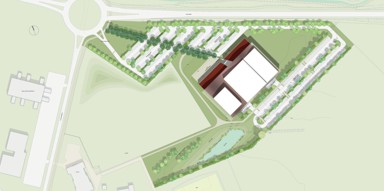 Le projet se met en place selon les structures paysagères et hydrauliques existantes. Ainsi, les fossés de direction Est-Ouest, bordés de haies bocagères ont servi de lignes structurantes pour l’implantation du bâti et des espaces extérieurs. L’orientation des stationnements et des voiries intérieures selon ces axes a permis la mise en place de lignes de noues plantées de haies. Celles-ci renforcent les structures existantes et scandent des espaces de Stationnement fortement paysagés (500 emplacements).
